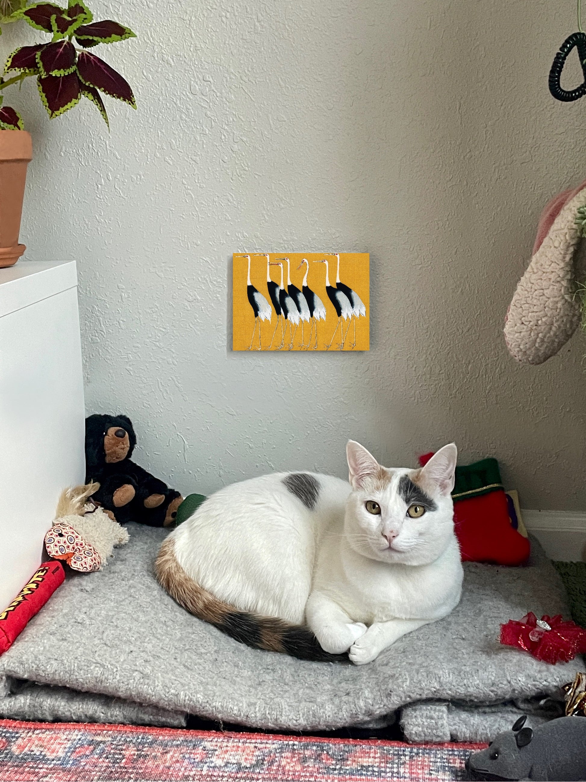 Un retrato tradicional de una bandada de hermosas grullas de corona roja japonesas