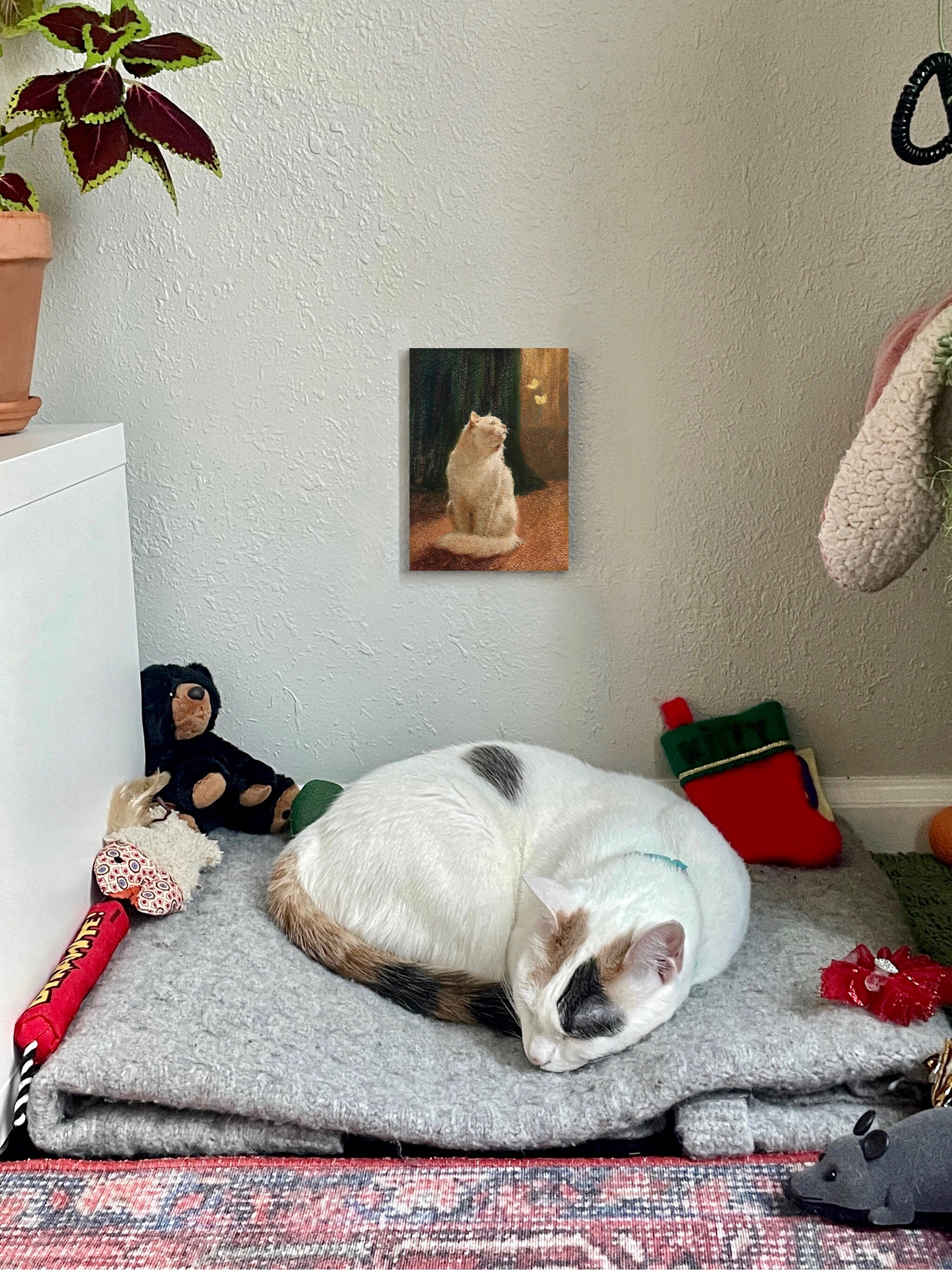 Gato blanco y dos mariposas de azufre.